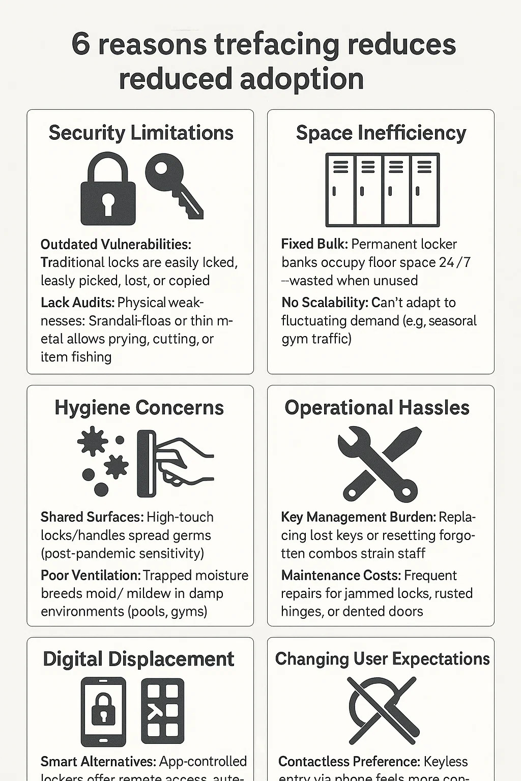 Lockers in usu manent, sed facies adoptionis reducta in nonnullis adiunctis ob has practicas vices: